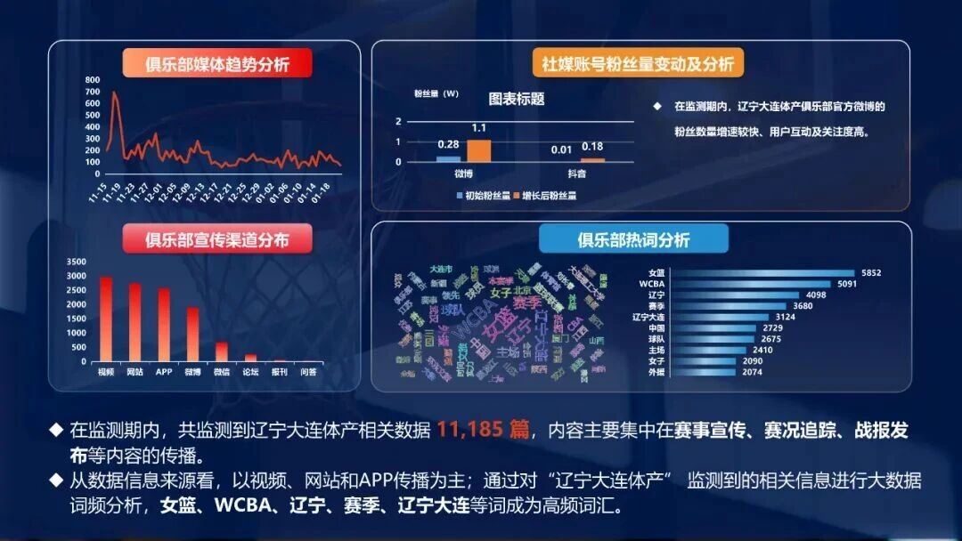 2024-2025賽季W(wǎng)CBA聯(lián)賽頻頻登上各大自媒體平臺熱搜,累計登上熱搜達217次,同比增長48%。新華社、人民日報、央視等權威媒體深度報道,聯(lián)賽搜索指數(shù)日均近5000次,資訊指數(shù)突破11萬。俱樂部在全網(wǎng)監(jiān)測數(shù)據(jù)達11,185篇,內(nèi)容覆蓋賽事宣傳、賽況追蹤、戰(zhàn)報發(fā)布等,彰顯強大傳播力與粉絲粘性。