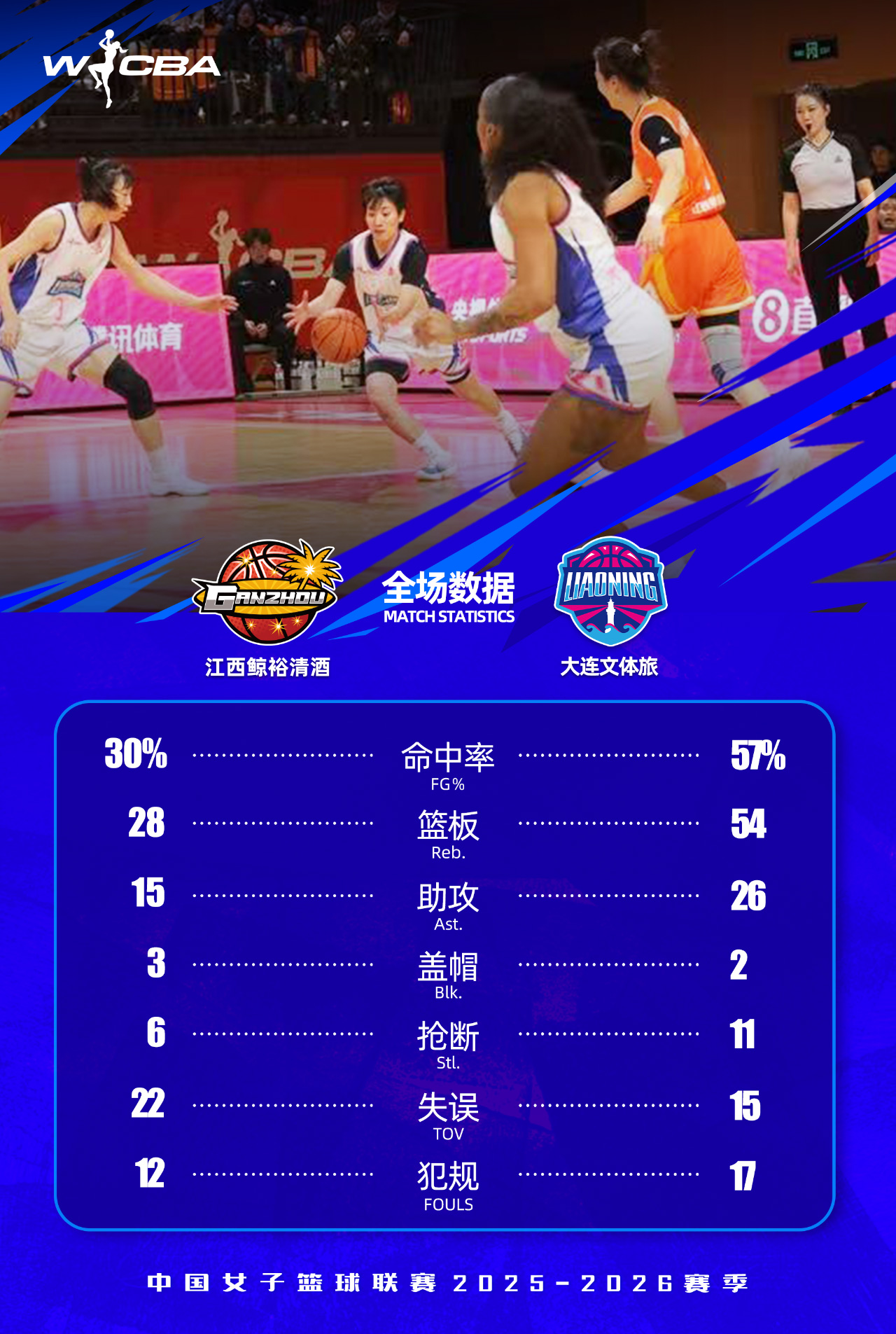 北京時間2025年12月8日19時30分,2025-2026賽季W(wǎng)CBA常規(guī)賽第三輪,大連文體旅女籃客場對陣江西鯨裕清酒女籃。全場比賽大連文體旅女籃攻防兩端表現(xiàn)穩(wěn)定,始終掌握比賽主動權,最終以111:59戰(zhàn)勝對手,收獲常規(guī)賽三連勝!