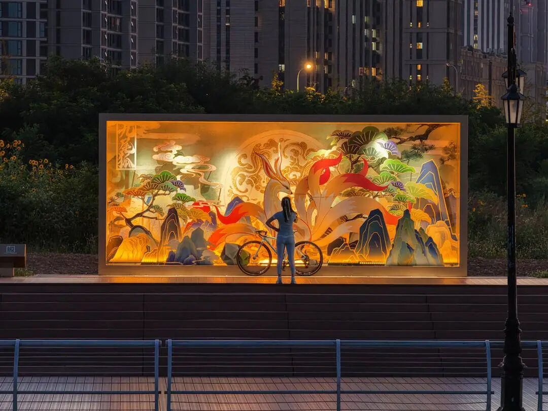 踏入山海經(jīng)文化休閑棧道,一場(chǎng)穿越千年神話的光影奇旅瞬間開啟。約1200米的棧道,宛如一條時(shí)光隧道,將《山海經(jīng)》的文化元素巧妙融入。7處大型立體繪本藝術(shù)裝置錯(cuò)落分布,九尾狐、金烏等靈獸栩栩如生,共工觸山、女媧補(bǔ)天等傳說躍然眼前。白晝時(shí)分,陽光灑在裝置上,散發(fā)著神秘氣息;夜幕降臨,光影交織,古老神話仿佛觸手可及。來自鄭州的游客何琦興奮地說:“白天看這些裝置,就覺得特別精美,晚上燈光一亮,感覺真的走進(jìn)了神話世界,太神奇了!”