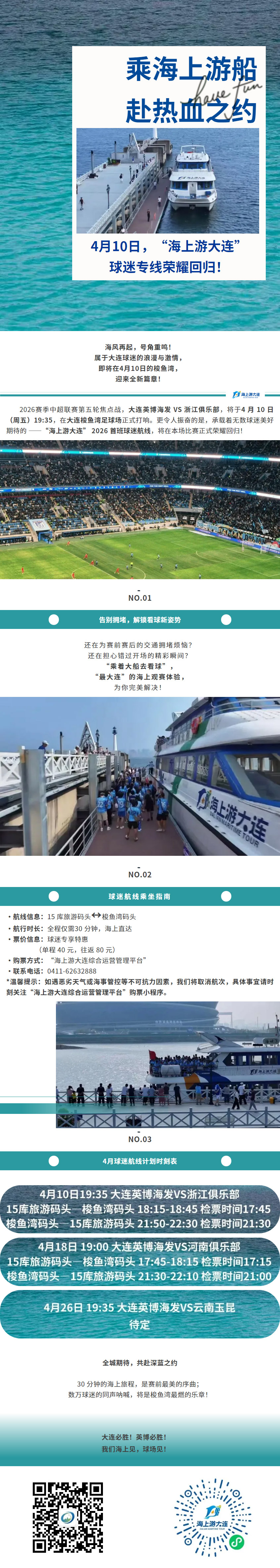 乘海上游船,為大連助威!4月10 日,“海上游大連”球迷專線榮耀回歸!