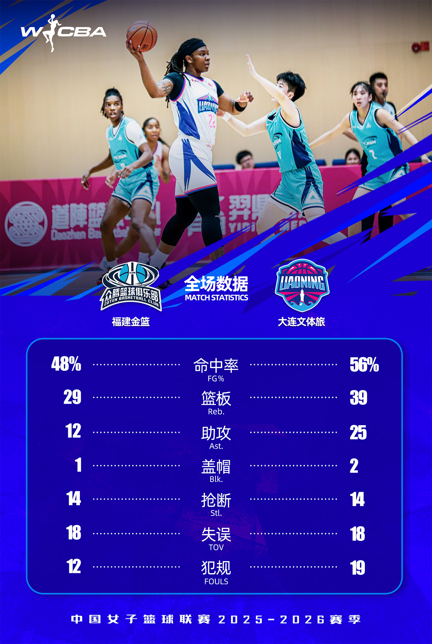 北京時間2025年12月29日19時30分,2025-26賽季W(wǎng)CBA常規(guī)賽第十輪展開較量,大連文體旅女籃客場對陣福建金籃女籃。全場比賽,大連文體旅女籃多點開花,始終掌握場上主動,最終98:82戰(zhàn)勝福建金籃女籃。