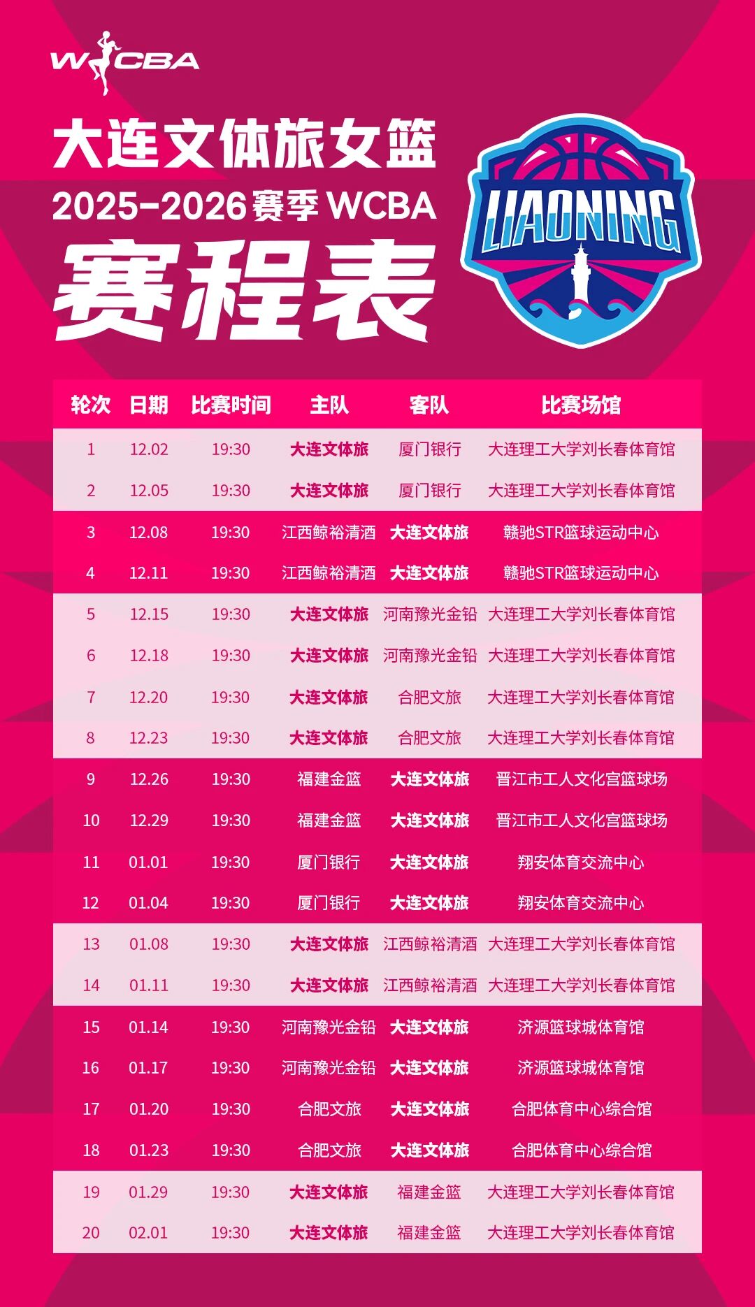 2025-2026賽季中國女子籃球聯(lián)賽(WCBA)官方賽程表已公布,大連文體旅女籃新賽季首場比賽將于2025年12月2日拉開帷幕,揭幕戰(zhàn)大連文體旅女籃坐鎮(zhèn)主場——大連理工大學(xué)劉長春體育館,迎戰(zhàn)廈門銀行。詳細(xì)賽程表見下圖,歡迎廣大球迷朋友們收藏。