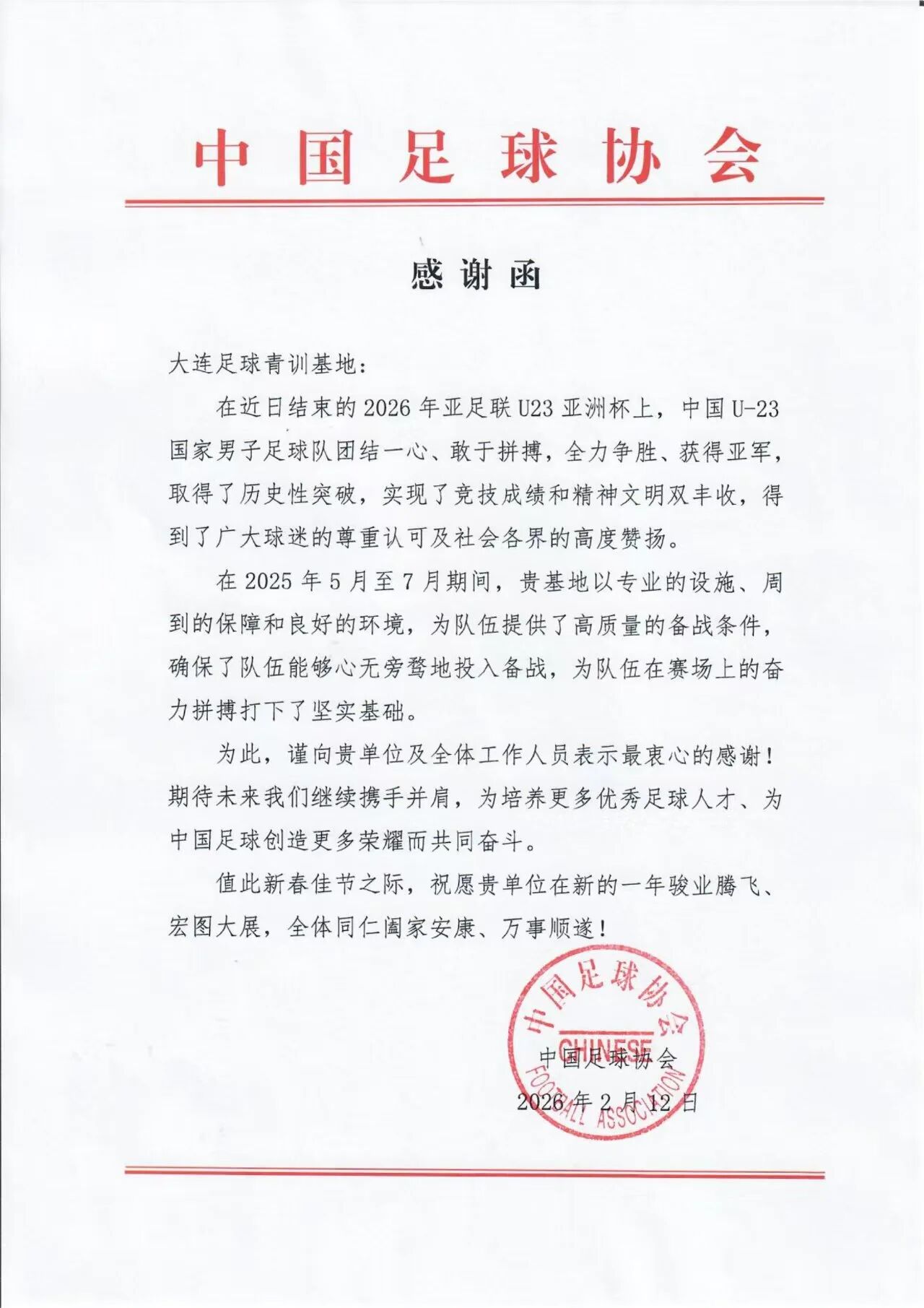 2026年2月12日,中國足協(xié)致函大連足球青訓(xùn)基地,對基地在2025年5月至7月期間為中國U-23男足提供的專業(yè)設(shè)施、周到保障、良好環(huán)境等高質(zhì)量備戰(zhàn)條件給予高度認(rèn)可。
