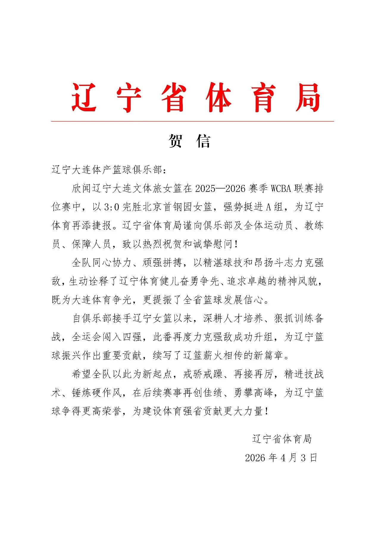 省、市體育局發(fā)文祝賀!大連文體旅女籃3:0強(qiáng)勢晉級WCBA聯(lián)賽A組 2026-04-04