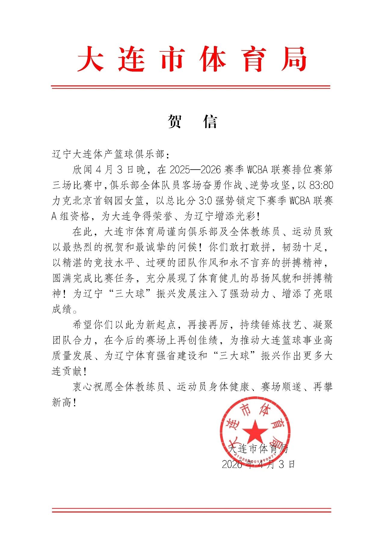 4月3日客場取得勝利后,遼寧省體育局、大連市體育局相繼發(fā)文祝賀,向大連文體旅女籃全體運(yùn)動員、教練員及工作人員熱烈祝賀和誠摯慰問!肯定球隊不畏強(qiáng)手、敢打敢拼的體育精神,并期許球隊以此次晉級為新起點,在后續(xù)賽事中再創(chuàng)佳績!