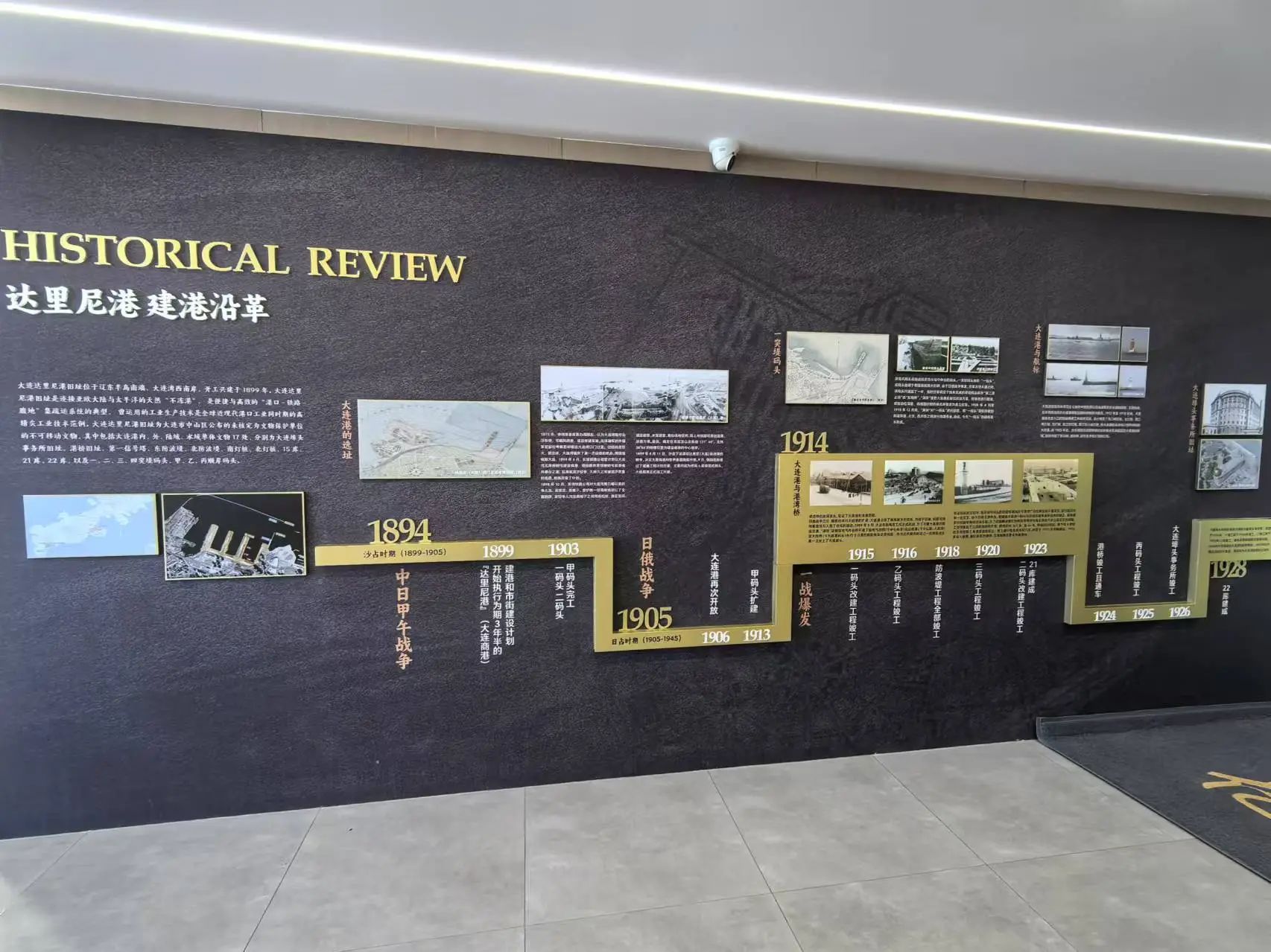 歷史文化墻位于文化體育公園場館主樓走廊兩側(cè),長12米,以時間軸為脈絡(luò),將達(dá)里尼港的歷史變遷娓娓道來,同時也展示了大連港在經(jīng)濟(jì)文化領(lǐng)域的發(fā)展成就,以及廣大民眾在歷史洪流中所作出的不可磨滅的貢獻(xiàn)。